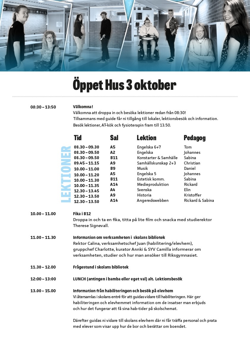 Du anmäler dig nedan och får en länk där du kan följa oss under dagen. Vi kommer att guida dig runt i våra lokaler, besöka lektioner, habiliteringen och elevhemmet. Du får träffa personal och nuvarande elever, får information och kunna ställa frågor.